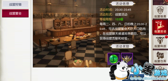 宴会活动是属于答题类活动,是大家工作之余放松的休息时刻,还能了解下游戏相关的知识,和其他盟友进行互动,答题需在聊天频道进行问题抢答,经验的奖励极高,前期冲级阶段能让你蹭蹭蹭的涨,还可以获得战盟的贡献,每天铁定要及时参与~