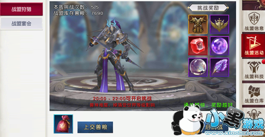 狩猎活动顾名思义就是集齐大家的兽粮贡献才可开启BOSS挑战,BOSS难度随着世界等级提高而增加,兽神BOSS掉落的装备、道具非常的丰富极品,参与的成员均能获得战盟贡献奖励,伤害排行前列的玩家,还可以得到额外的贡献奖励,奖励非常可观哦,是开服前期获取高品质装备和道具的极佳途径,大家要留意活动的开启,及时的呼唤大家参与BOSS挑战!