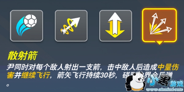 尹同时对每个敌人射出一支箭,击中敌人后造成中量伤害并继续飞行,箭矢飞行持续30秒,碰到边界会反弹。