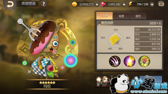 背景故事:外貌可爱的兽人族,非常喜欢甜食,总是肚子饿,据说玛伦那空间无限大的箱子里装满了包括食物在内的各种稀奇古怪的物品