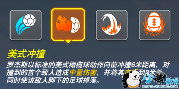 罗杰斯以标准的美式橄榄球动作向前冲撞6米距离,对撞到的首个敌人造成中量伤害,并将其击退到8米外,同时使该敌人脚下的足球掉落。