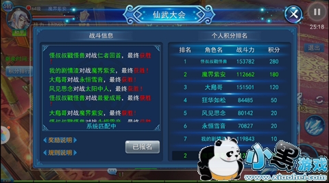 若是所有人都在一个竞技场上角逐天下第一,岂不是乱了套。30级或30级以上的道友,都可以来参加每日在20:30-20:55举行的“仙武之会”。随机分配对手,进行一对一的决战,胜者将会获得一定积分,等到周日的“仙武之巅”正式开启时,一周积分排名前十三的选手才有资格参加,摘取天下第一的称号。