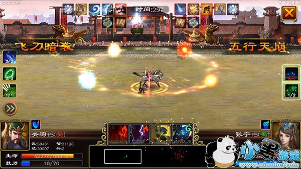 第五轮攻击后,副将杨威救了关羽一命,张宁的小兵也上去给关羽送血了。危险。所以张宁打关羽一定不要弓箭兵。