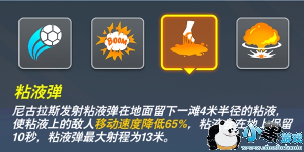 尼古拉斯发射粘液弹在地面上留下一滩4米半径的粘液,使粘液上的敌人移动速度降低65%,粘液会在地上保留10秒,粘液弹最大射程为13米。