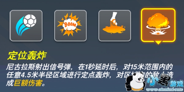 尼古拉斯射出信号弹,在1秒延时后,对15米范围内的任意4.5米半径区域进行定点轰炸,对区域内的敌人造成巨额伤害。