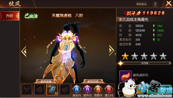 进阶需要消耗进阶石,点击进阶石可以查看获取途径,每阶有五星,每提升一星会永久增加主角对应属性