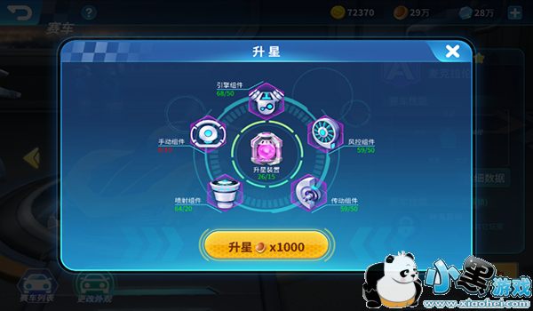 得到一辆赛车不代表可以发挥出它的全部实力,想要激发赛车潜力,需要给他一个“五星好评”。将赛车升到五颗星,赛车的性能将发生翻天覆地的变化。不同等级的赛车和不同星级的赛车升星材料都不同,一般需要相应等级的升星装置、引擎组件、风控组件、传动组件、喷射组件和手动组件。其中,只有四星升五星需要手动组件,升星装置是通用的。