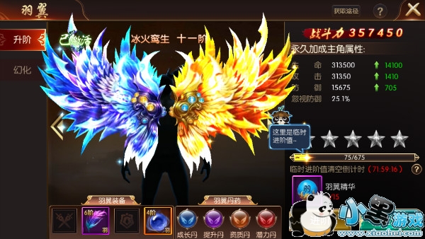 羽翼每阶分为5星,提升一星会增加主角相关属性且会有一个临时进阶值,提升到5星会升阶,升阶会改变出现一个新的羽翼形象