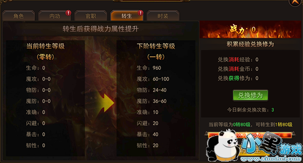 转生需要消耗修为,转生的修为有两种途径可以获得,一是用经验和金币兑换,二是直接用元宝买修为丹。