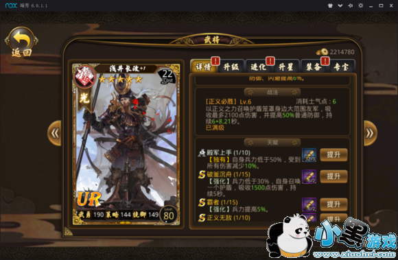 战法:正义 6士气,CD30s,自身半径15m,友军护盾&普防50%,持续20s 技能评价三星半。