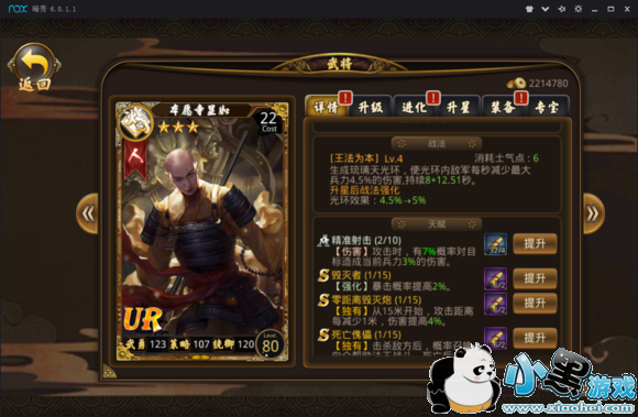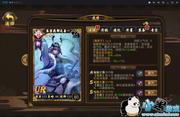 战法:鬼若子 5士气,CD45 变身,最大兵,攻击提高100%,击杀攻速加100%,持续35s 技能评价五星。