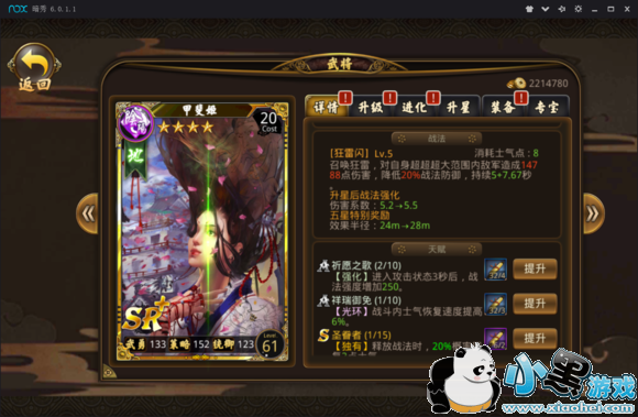 战法:狂雷闪,8士气,CD45s,自身半径28m,对敌军战法伤害S+,降低战防20% 技能评价四星。