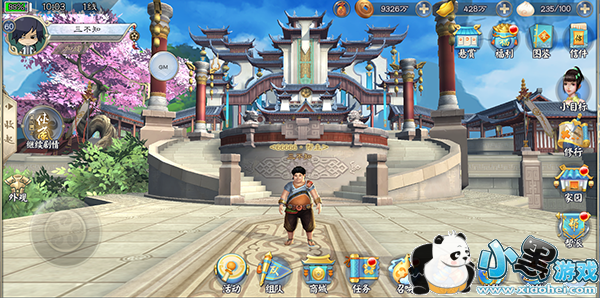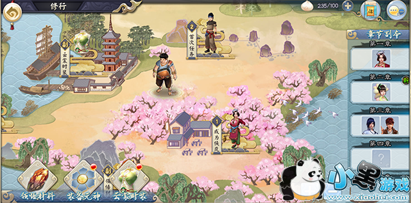 1、靠右边展示内容依次为:阶段小目标、修行(主要任务场景)、家园、帮派