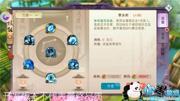 寒冰刺:使用冰霜刺攻击1名敌人,造成法术伤害,若目标处于被控制状态且技能暴击时,额外增加50%暴击程度。