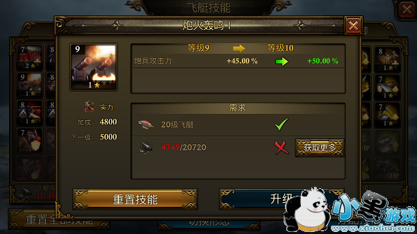 飞艇技能有很多,可以为自己的部队增加属性。如下图所示,随着飞艇等级的提升会解锁更多的飞艇技能,有4类技能栏可以放置技能,比如攻击栏放些攻击属性加成,军队防御类的技能。而采集是放些增加产量或者承载的技能。