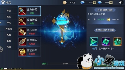 《天使圣域》的神兵需要通过消耗对应的神兵石进行解锁,而在解锁之后,还可以继续使用对应神兵石进行升阶锤炼。生命神兵的作用是为玩家角色增加生命值,其所需的生命神兵石可以通过异界探索获得。