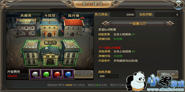 势力建设中的4大建筑,会给予玩家重要的buff。提高生命的聚义厅,提高经验获取的斗技馆,提高伤害的兵器库和提高伤害吸收的炼丹楼。每一个buff都是百分比提升,不可或缺。