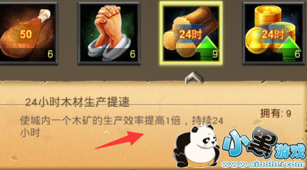 点击每个木矿的信息,可以查看每小时这个木矿的产出量。点击资源提速,需要消耗道具:24小时木材生产提速(活动或是任务获得)。使用这个物品,可以24小时提高一个木矿的生产效率多一倍。