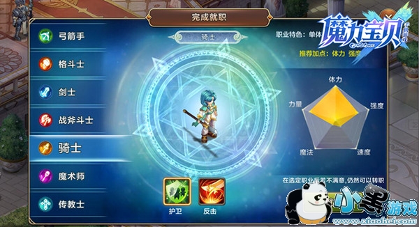“骑士”在人物的游戏定位中是属于防御型,以高命中和反击、护卫等形式来进行输出,在游戏中起到类似于坦克的作用,为生存能力较弱的队友充当挡箭牌。“骑士”的职业技能平时是以连击为主要输出,在PVP中更多的是使用技能为反击或圣盾。因此推荐勇者们在加点是选择“力量”,配合“力量”和“速度”加点。
