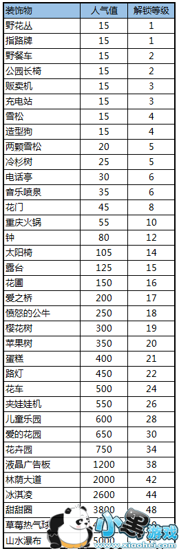 今天肉肉跟大家聊聊通过花费金币购买装饰建筑来增加人气值时,获取不同装饰物需要达到什么样的等级?又能增加多少人气值呢?如下表: