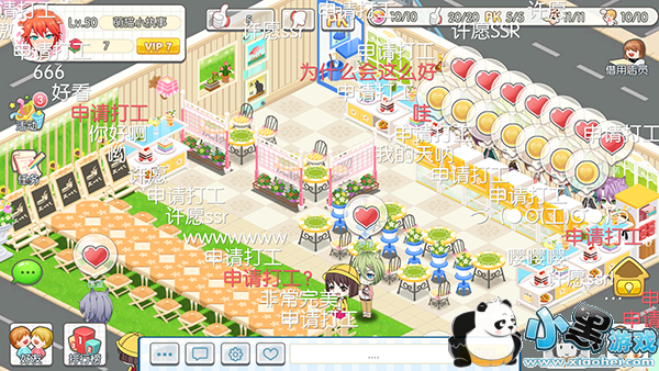苦心经营的甜品店日益壮大,若干猫美男陪伴在身边,当然想与朋友一同分享喜(xuan)悦(yao)之(yi)情(xia)。游戏中可以与好友亲密互动,拜访好友,随心所欲的为他点赞、送花、发送弹幕留言,还可以与他PK一决高下。当然,友谊第一,或许借用店员,帮助好友完成订单才是最好的选择。