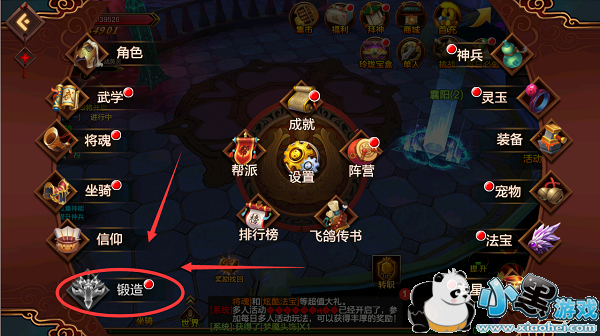 先点击游戏主界面左上方的角色头像,这时游戏主界面上方会弹出菜单栏,再点击菜单栏中的“锻造”,即可进入游戏的锻造功能。