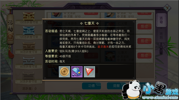 昆仑天域,七重宫阙之上,便是天机宫的总部之所在。玲琅仙境的外表下,究竟隐藏着多少秘密,在等待着我们一探究竟。然而七重天的每一层宫阙都有着神兽守护,闯关难如登天,只有集结队伍,商讨策略,才有一战之力。当大人等级达到45级后,可以开启七重天玩法。七重天是组队玩法,至少三人组队才可以进行该玩法,活动的持续时间为全天。参与七重天玩法,有几率获得金币、宝石甚至唤宠灵符的丰厚奖励!