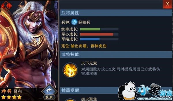在吕布的神器方天画戟觉醒后,实力会来到一个新的层次,当吕布兵力低于50%时,可以提升伤害与攻速,同时在释放天下无双时进入到无敌状态。在突入敌军时,如入无人之地,杀敌人一个片甲不留。在坐骑的配备上,则更无须多言,直接选择真