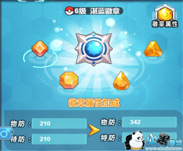 徽章的获取方法则是挑战道馆任务获得徽章原石及徽章碎片,当集齐5个徽章原石可以激活一枚徽章,而徽章碎片则是徽章升级的材料。不同的徽章会提升不同的能力,例如湛蓝徽章就是提升物防和特防这两项能力。
