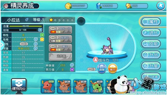 小拉达的种族值为253,以72的数值速度见长,可在性格的洗练中洗出相对应的属性即可,发挥其高速度的优势。