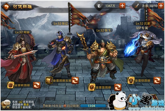 游戏一般在8级便引导结束,这时玩家应该有3个初始武将,这里建议首冲拿金将“绝色貂蝉”凑齐4个武将。而上阵5名武将则需要军衔达到“威烈将军”,而军衔需要声望来提升,声望的主要来源为竞技场和军团战。有能力的话也可在商店购买声望丹提升军衔,达到快速上阵5个武将的目的,快速提升战力。