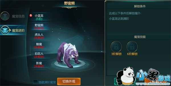 通关远古圣殿除了能得到魔宠口粮,还可以获得大量的魔宠精华。魔宠精华用于魔宠进阶,魔宠满阶为10阶,初级的魔宠满阶以后可开启更高品级的魔宠,如小蓝龙满阶以后将获得野蛮熊魔宠。品级越高的魔宠技能越多,技能效果也越强力。
