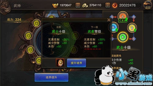 武神可以通过消耗灵力提升等级,当等级提升到瓶颈时可以通过消耗特殊道具提升进阶,从而获得更高的等级上限和更炫目的武器特效。当4种武神的境界升级到同一个阶段,可以获得共鸣的额外属性提升。