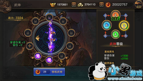 每个武神的基础属性与境界属性都不同,装备其中一个可以获得该武神的基础属性以及境界属性。