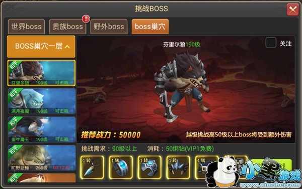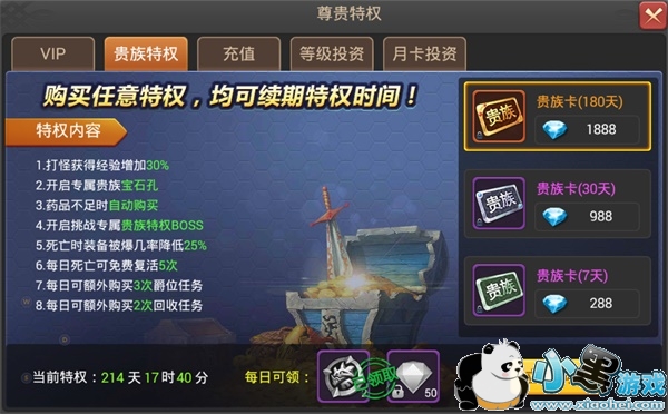 (2)可以击杀boss的地方:世界boss,贵族boss,野外boss,boss巢穴。贵族boss需要购买贵族特权卡(288/888/1888钻石三个档次)之后才能挑战。