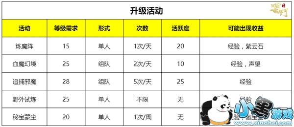 当有了一定等级的累计,并且卡等级还没有下一个主线任务的时候就可以通过图中提供的几种方式来获得额外的经验,参加活动的方式是点击在界面上方的天书按钮,选择对应的活动组队或单人进入即可。