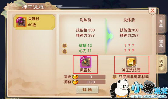 60级开启神工洗练功能,如对锻造、升品出来的装备属性不满意,可通过神工洗练功能进行洗练,需要消耗任意40级以上的传说装备、相应数量的神工洗练石,亦可消耗元宝锁定单一属性类型进行洗练,来获得符合自身需求的完美属性。