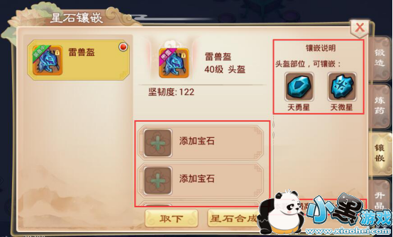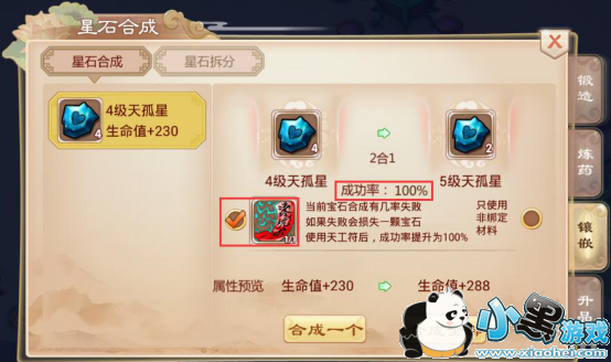 星石合成套嵌在镶嵌功能里面,通过这个功能把低级星石合成高级星石,以获得更强大的属性。要注意哦,每个等级的星石合成成功率都是不一样的,可以使用相应数量的“天工符”将成功率提升到100%,还可以批量合成,赞一个~