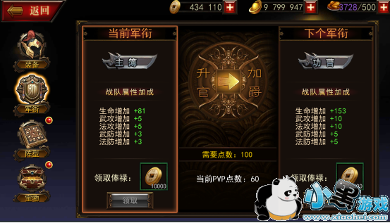 主公军衔同样是能够升级主公的重要属性之一,提升军衔的方式则是通过每天参与竞技场来获得足够的PVP点数,PVP点数越多激活的军衔等级也就越高,激活的属性增加的越多哦~