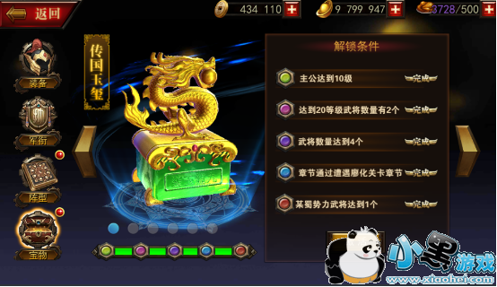 主公宝物需要满足不同的条件才能够开启,游戏中共设立的七个主公宝物,分别是:传国玉玺、七星宝剑、长生宝灯、和氏玉璧、九州皇鼎、绕梁古琴。每一个宝物激活的条件都是不一样的,并且主公宝物也是可以升级的。宝物的升级也能够为主公提供大量的属性提升。