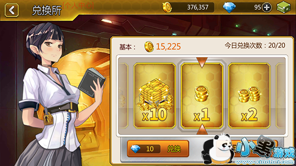 根据VIP等级的不同,每天最高300次机会,可选择单次兑换或十连兑换,以消耗钻石兑换金币的形式进行。兑换次数越多钻石消耗越多,兑换后有一定几率获得多倍收益,达到一定VIP等级后可开启保底2倍收益。