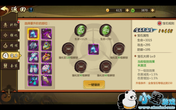 【宝石】根据装备的强化等级逐步解锁宝石孔。每个部位的装备能镶嵌的宝石也各有不同。当全身宝石的总等级达到一定的等级时可以获得对应等级的宝石大师评价,并获得大量的属性加成。