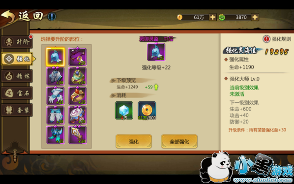 【强化】装备强化上限跟装备品阶相关,品阶越高,可强化等级越高。装备强化所需要的材料一般有“强化石”、“金币”、“高级强化石”。当全身每件装备都达到一定的强化等级时可以获得对应等级的强化大师评价,并获得大量的属性加成呢。