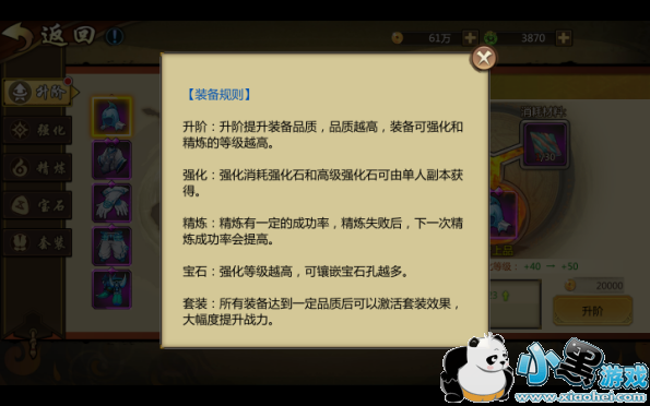 最后提醒一下,装备的升阶是基础中的基础,因为装备的品阶会直接或间接地影响到“强化”、“精炼”、“宝石”,还有开启套装效果,激活套装属性。所以一定要记得在进行装备强化操作时先把装备的品阶升上去哦~!
