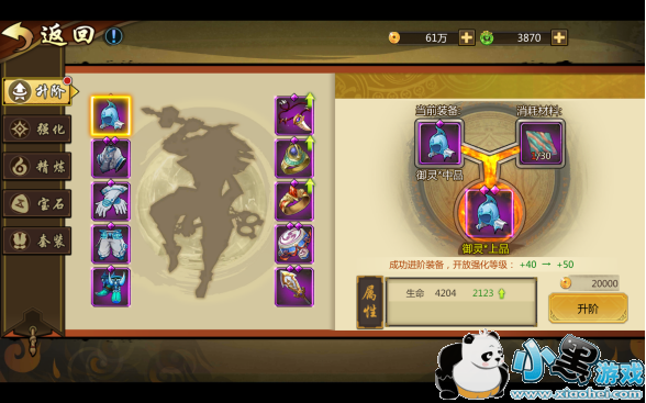 【升阶】在装备系统界面点击“升阶”,即可进入装备升阶的画面,各个部位升阶所需要的材料各不相同。具体分为“武器升阶石”、“防具升阶石”、“饰品升阶石”。升阶可提升装备品质,品质越高,装备可强化和精炼的等级越高。所以装备升阶是强化装备的必备步骤,千万别忘记进行装备升阶哦~!