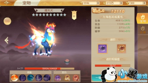 ①:消耗指定道具即可对宠物进行升阶,宠物升阶可增加主角生命、攻击、防御、破甲,阶数越高,获得的数值越高。