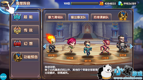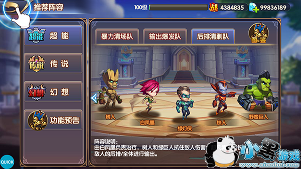 由白凤凰负责治疗,树人和野蛮巨人抗住敌人伤害,绿灯侠和铁人两个主将对敌人的后排/全体进行输出。