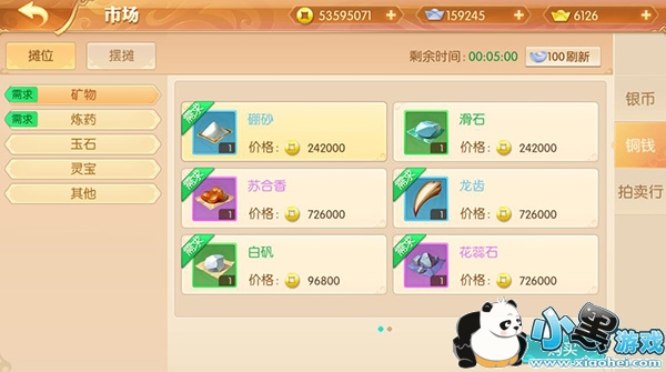 可以购卖铜币道具,包含矿物,炼妖,灵宝等道具