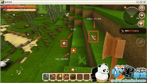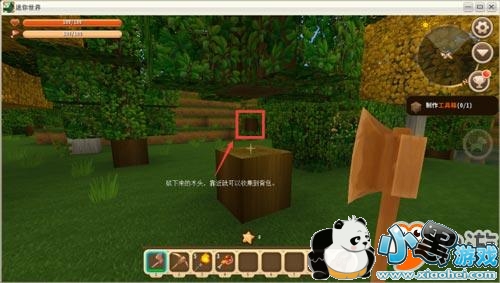 手持斧头,电脑版摁住鼠标左键(手机手指摁住木头块)出现进度条,进度条达到100%会掉落木头方块,靠近便可以收集到背包。