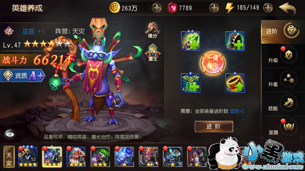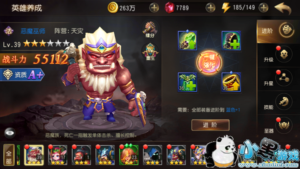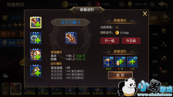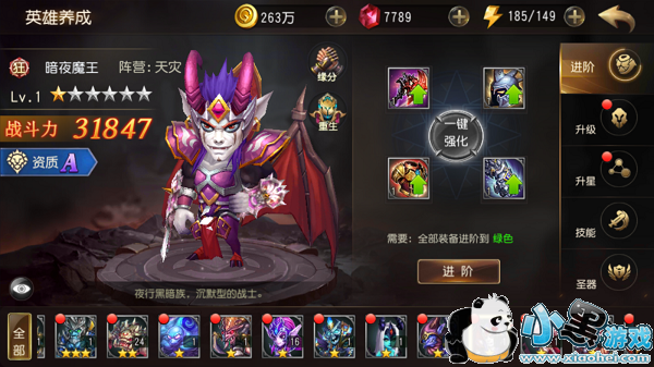 每个英雄初始拥有4件装备,可提升英雄的属性。另外,全套装备达到要求的英雄,可进行进阶,使英雄的品质提升。